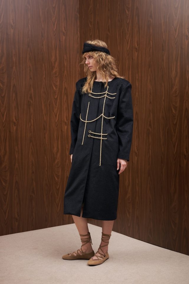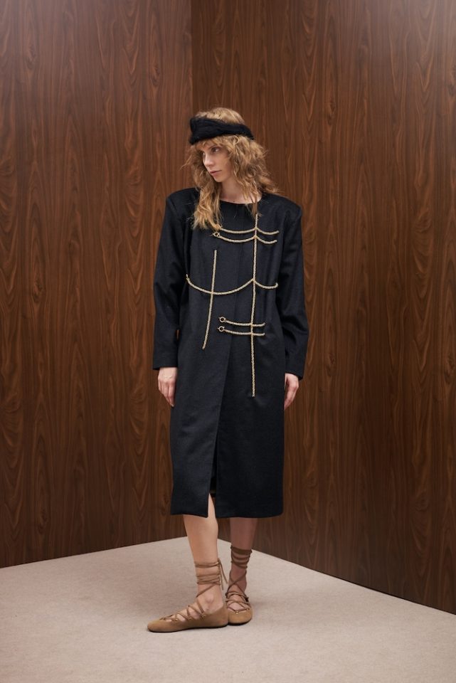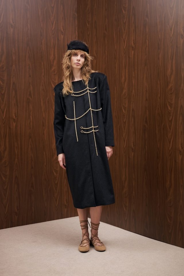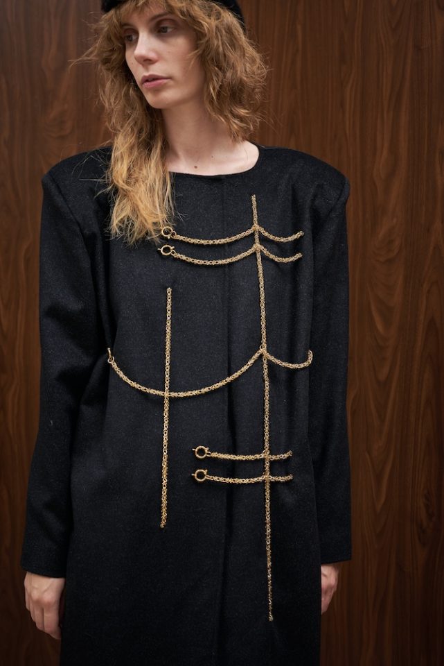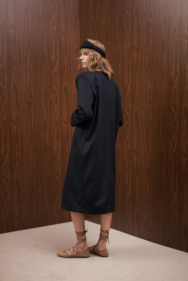 Coal Grey Wool and Cashmere Coat. Wool and Cashmere are Heavy-weight, Non-stretchy fabrics. 80% Wool, 20% Cashmere ; Lining 100% Viscose. Collarless. Padded Shoulders. Two internal welt pockets. Chain fastenings through front. Fully lined. Cut for a slightly loose fit. Dry clean. Model is 183cm and is wearing a size M.