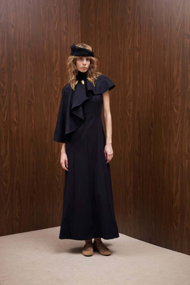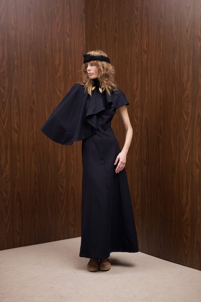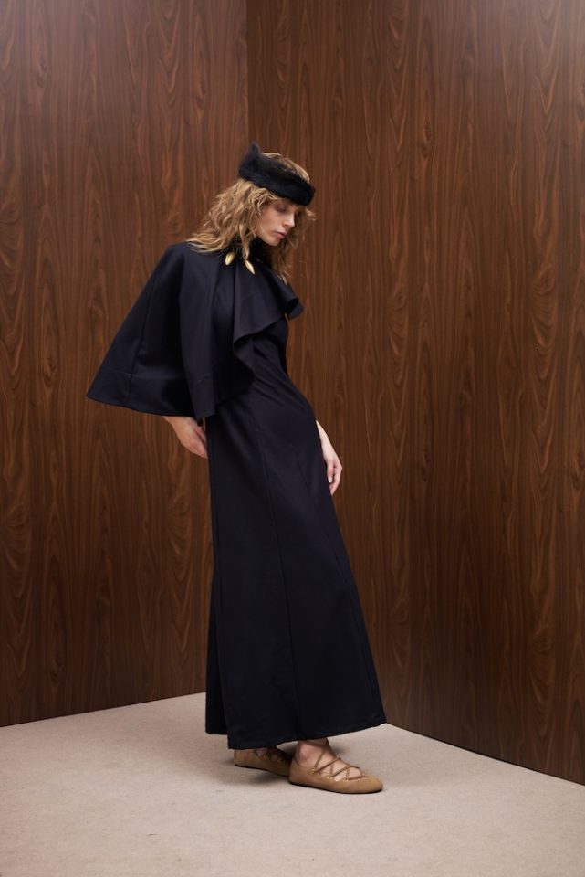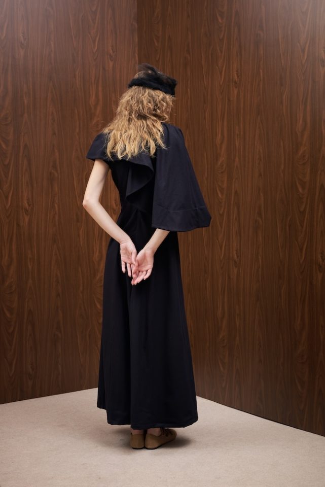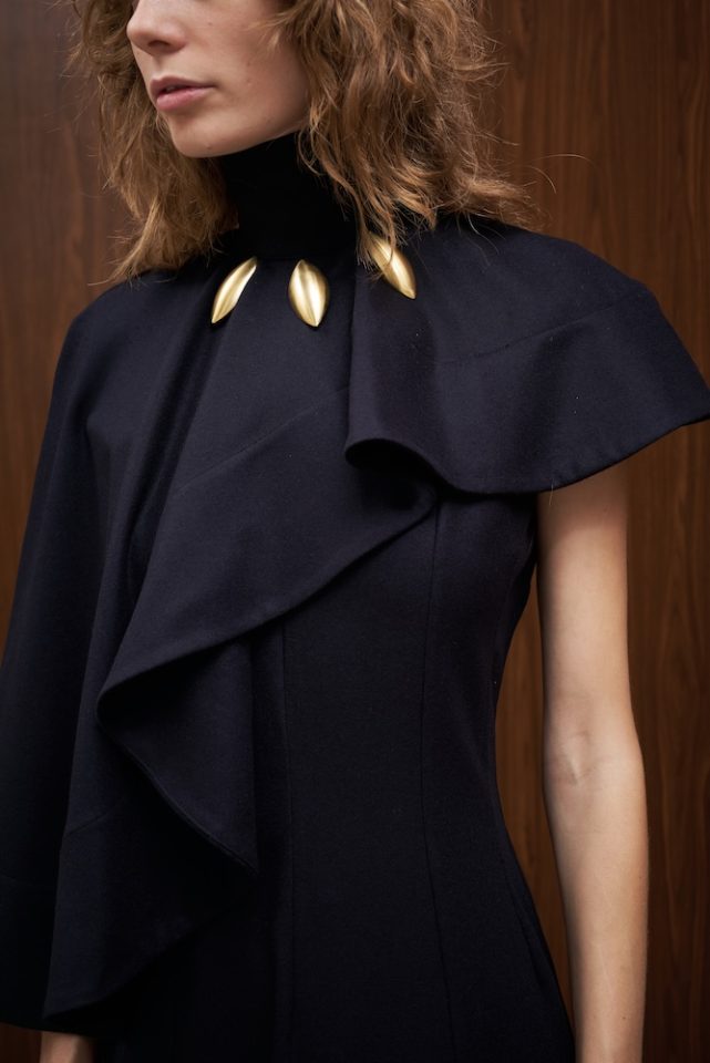 Black Ecological Wool Dress. Wool is a Mid-weight, Non-stretchy fabric. 100% Ecological Wool. Stand collar. Cape-like sleeves. Decorative brass appliqués at front, inspired by Edinburgh's History. Concealed zip fastening and button-fastening keyholes at back. Fitted at the waist and bust, loose at the hip. Maxi-length. French seams. Hand Wash or Dry clean. Model is 183cm and is wearing a size XS.