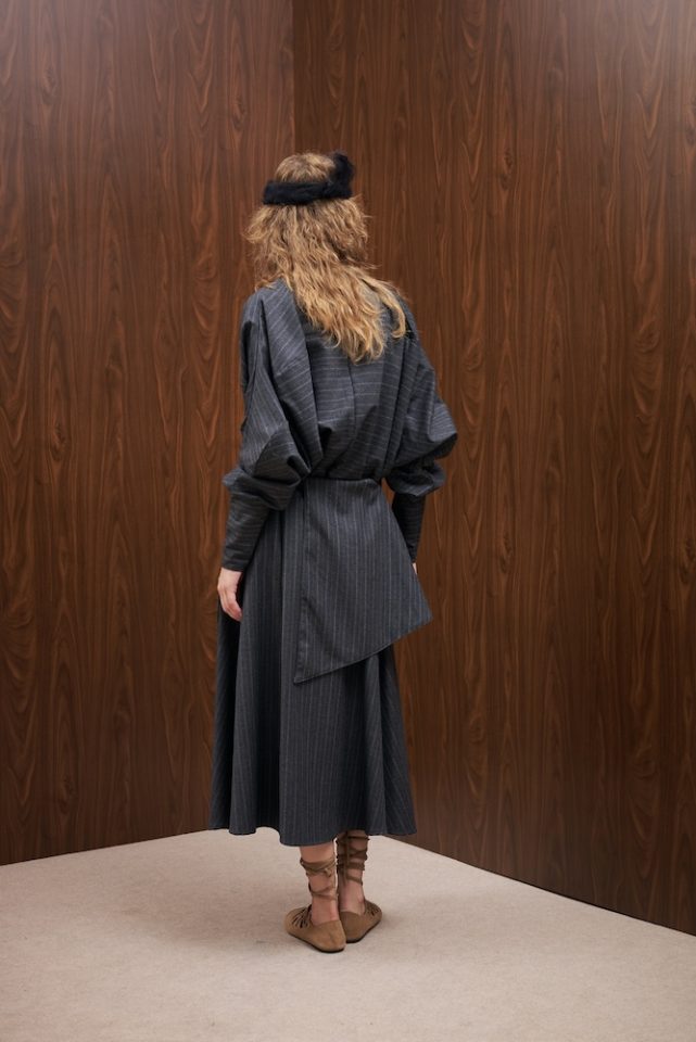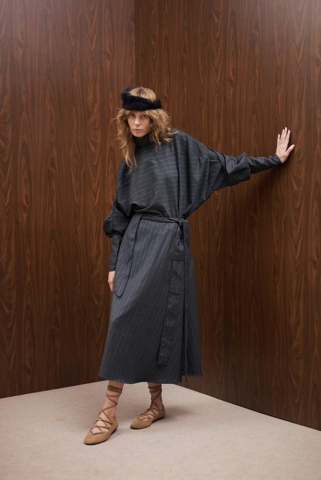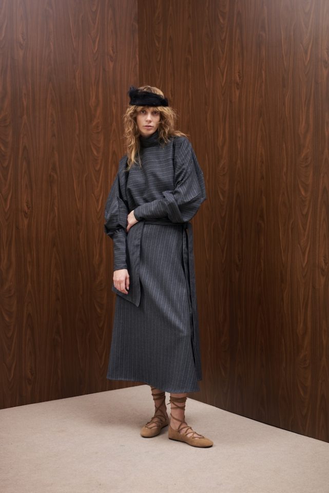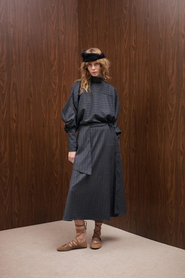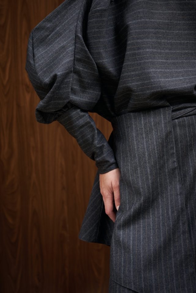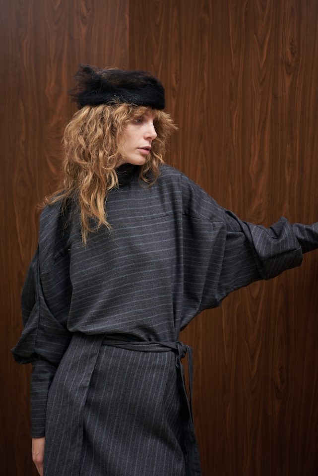 Grey Pinstripe Fine Wool Blouse. Fine Wool is a Light-weight, Non-stretchy fabric. 100% Wool. Batwing sleeve. Stand collar. Button-fastening keyhole at back. French seams. Cut for a loose fit. Hand Wash or Dry clean. Model is 183cm and is wearing a size S.
