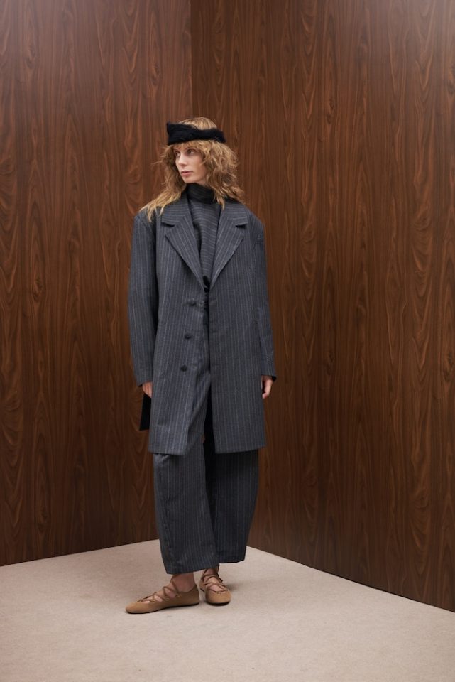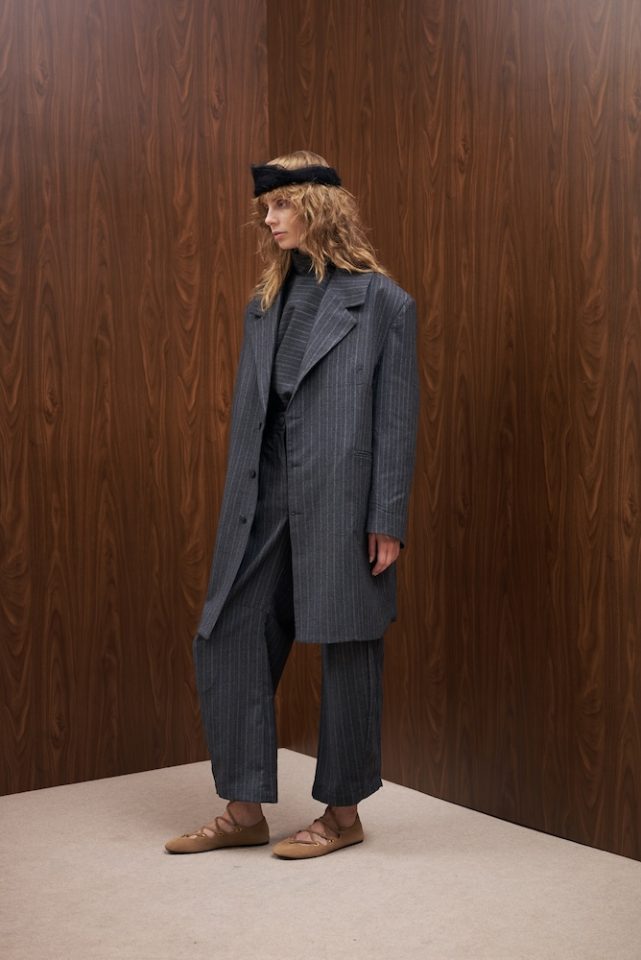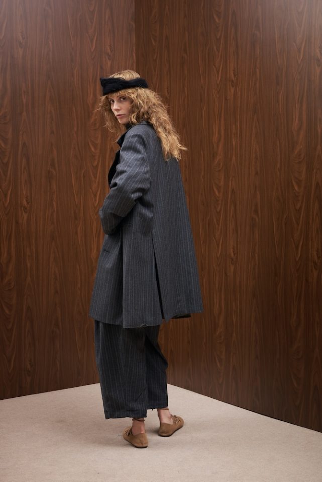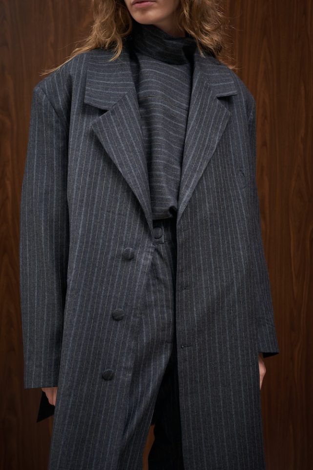 Grey Pinstripe Fine Wool Coat. Fine Wool is a Light-weight, Non-stretchy fabric. 100% Wool ; Lining 100% Viscose. Notch lapels. Padded Shoulders. Oversized. Two welt pockets at front and two internal welt pockets. Button fastenings through front. Fully lined. Cut for a loose fit. Dry clean. Model is 183cm and is wearing a size M.