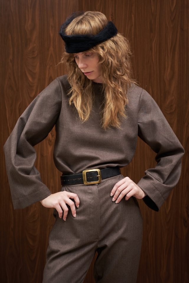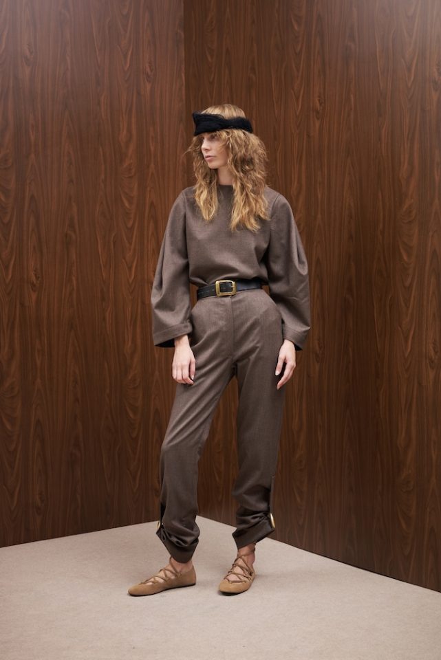 Chestnut mélange Wool Trousers. Wool is a Mid-weight, Non-stretchy fabric. 100% Wool. Cigarette silhouette. Gathered at the sides. Concealed zip and button fastening. Two side slant pockets. High-rise, sits at the waist. French seams. Cut for a slim fit. Hand wash or Dry Clean. Model is 183cm and is wearing a size XS.