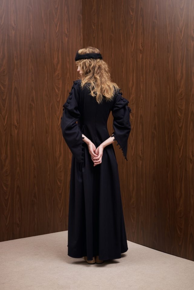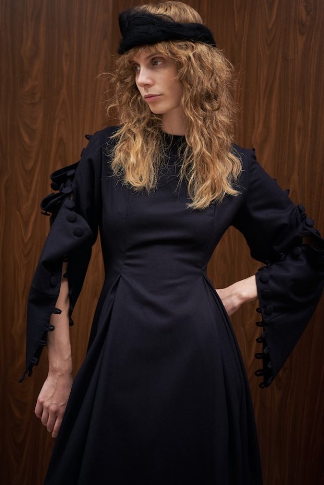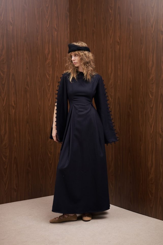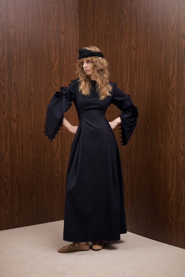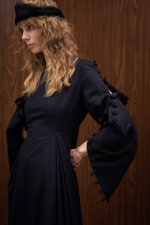 Black Ecological Wool Dress. Wool is a Mid-weight, Non-stretchy fabric. 100% Ecological Wool. Open, adjustable sleeves. Pleats through front and back. Concealed zip fastening at back. Fitted at the waist and bust, loose at the hip. Maxi-length. French seams. Hand Wash or Dry clean. Model is 183cm and is wearing a size XS.
